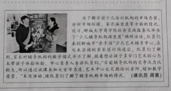 为了解目前少儿培训机构的市场态势,分析市场环境、家长满意度等方面的情况。近日,永利集团3044am官方入口永利集团3044am官方入口社会实践服务队举办了“少儿辅导机构满意度”调研活动。队员们来到聊城市“金手指”少儿艺术辅导中心,在与来咨询的家长进行沟通后,队员们了解到,家长对辅导机构的教学模式并不了解,抱着想让孩子多学门艺术的心态来带孩子体验体验。中心负责人告诉队员们:“目前辅导机构的竞争压力比较大,所以通过试课来加大宣传力度,艺术中心也定期培训老师,增加教学质量。”本次活动,使队员们了解了辅导机构市场的情况。(通讯员周昊)